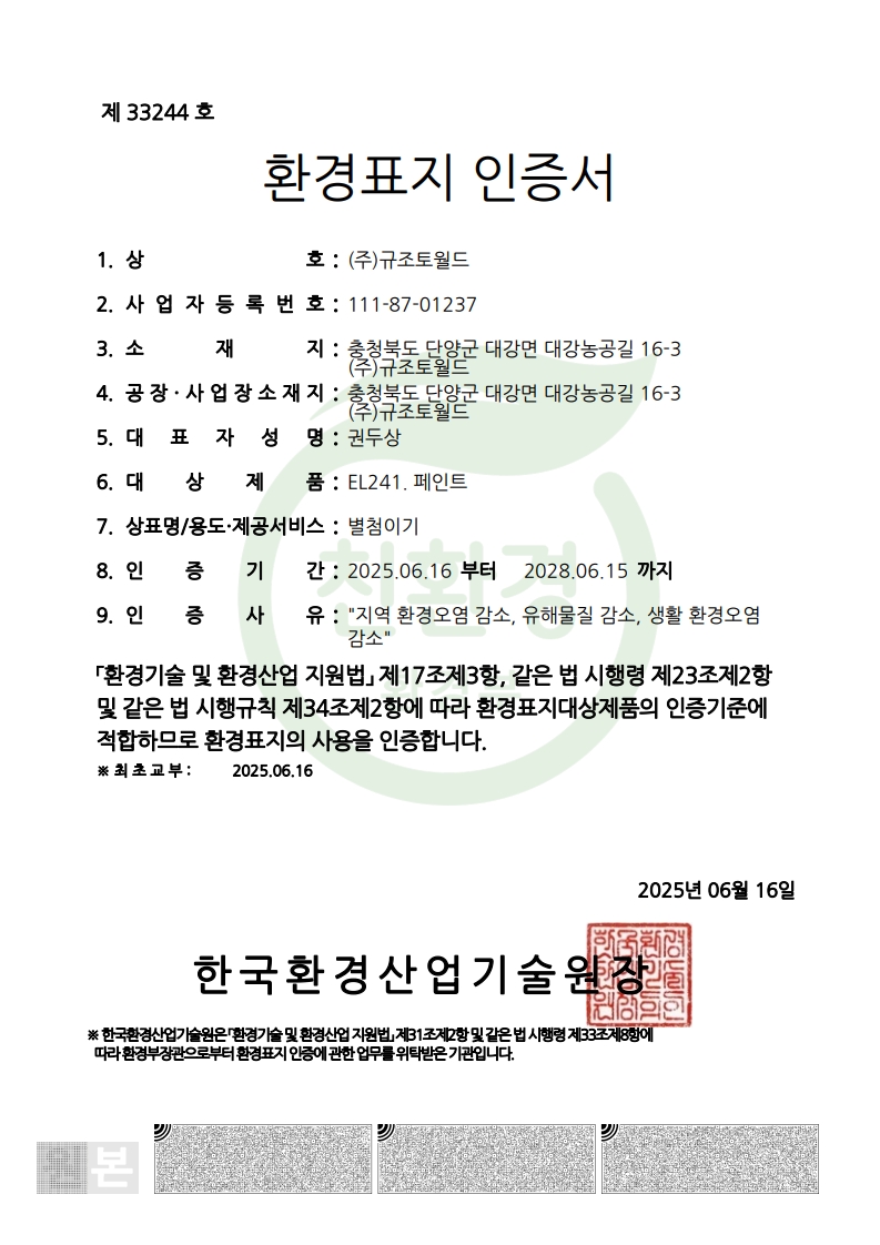 주식회사 규조토월드는 2016년 3월 28일 “환경표지” 인증서를 획득하였습니다.