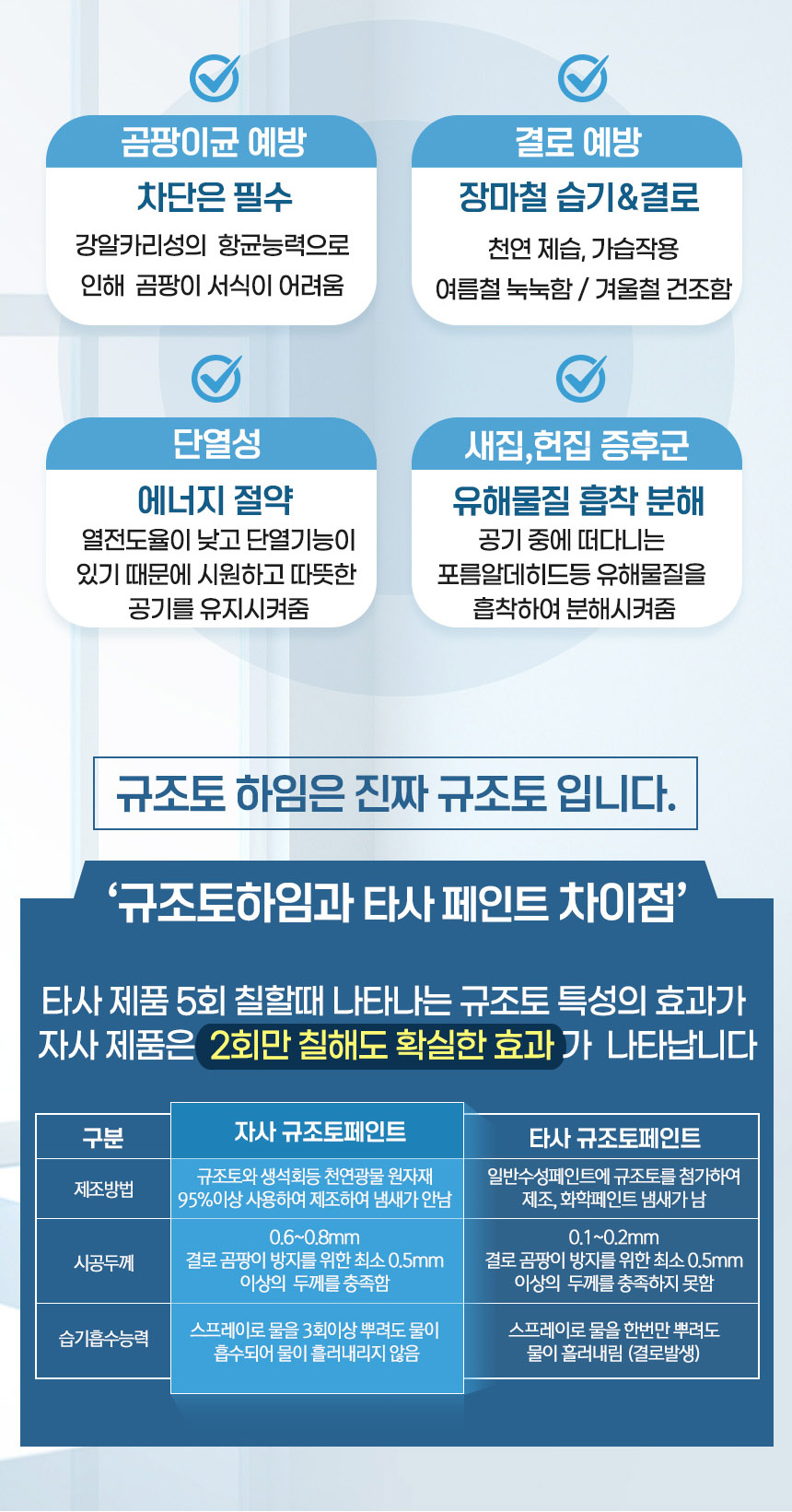 특정품질 - ☑결로,곰팡이 방지 ☑단열성 ☑내화성☑탈취 및 유해물질 흡착 분해기능